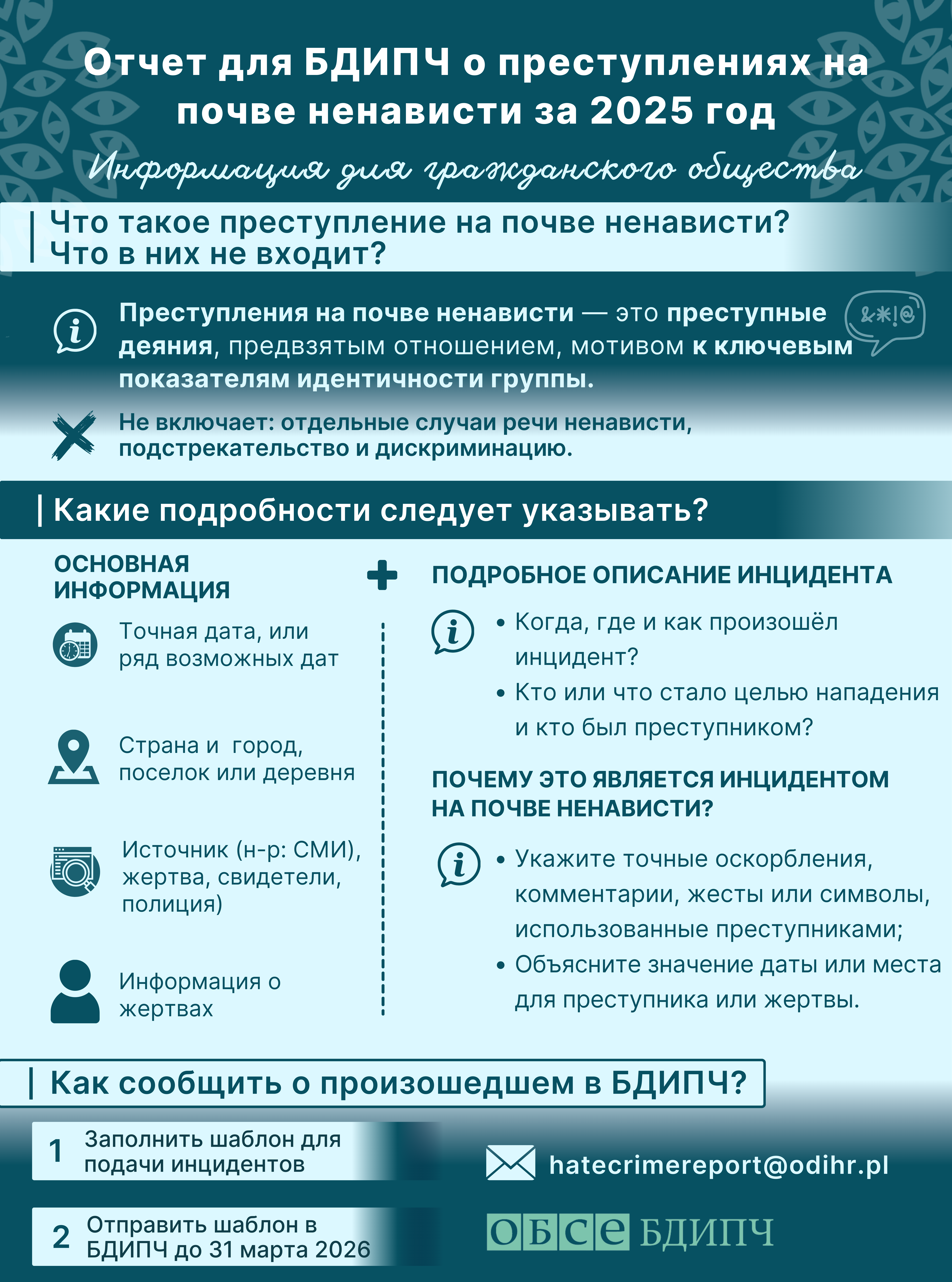 Отправьте Ваши инциденты в БДИПЧ до 31 марта 2026 года по электронному адресу hatecrimereport@odihr.pl.Вы можете отправить информацию используя шаблон.Вы также можете сообщить об инцидентах в предпочитаемом вами формате (например, отчёты о мониторинге, таблицы данных, и другие формы отчёта), при условии, что в представленных материалах содержится достаточно информации о каждом инциденте. Прочитайте информационную листовку. |